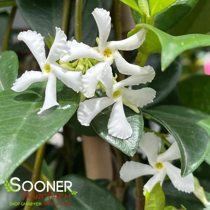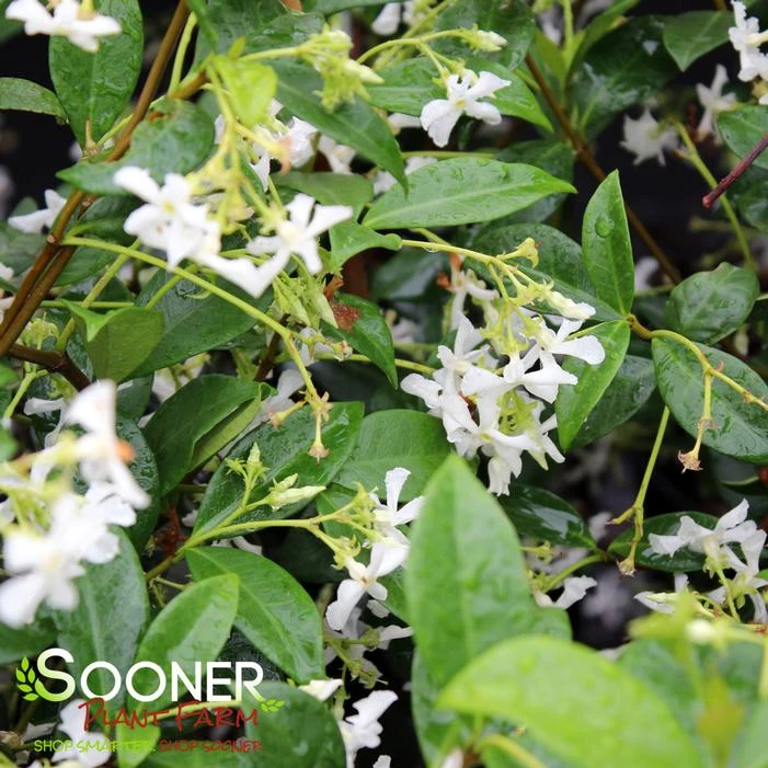 Buy Madison Star Hardy Jasmine online. Has glossy, dark green leaves and white, fragrant flowers that bloom in the late spring and sporadically thereafter. This variety is more cold tolerant than most other star jasmine. A twining evergreen vine, often used as a groundcover.