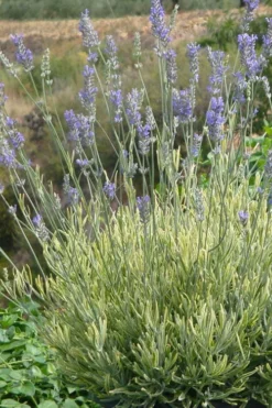 A multiple award winner, including Plant of The Year at the Chelsea Flower Show in London, England, ‘Platinum Blonde’ is a top notch English Lavender sporting showy variegated leaves of soft grey-green with wide, creamy soft-yellow margins that make this plant glow in the sunny garden. Beginning in early summer in the South and mid summer in the North and continuing through early fall, spikes of strongly fragrant, soft lavender-blue flowers rise above the neat and compact foliage mound. The flowers are a magnet to butterflies and other beneficial pollinators, and are excellent for cutting and use in flower arrangements and sachets. Also a fine culinary herb with a savory and sweet flavor. The fragrant foliage and oils from lavender are a staple in aromatherapy for their stress-relieving properties. Excellent for pots, garden beds and landscape borders. Just give this one at least 6 hours of sun per day and very well-drained soil and watch it grow.